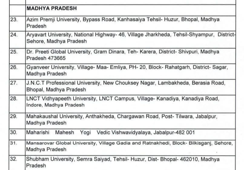 भोपाल– अजीम प्रेमजी यूनिवर्सिटी– जेएनसीटी यूनिवर्सिटी– शुभम यूनिवर्सिटी, सीहोर– आर्यावर्त यूनिवर्सिटी– मानसरोवर ग्लोबल यूनिवर्सिटी, इंदौर– एलएनसीटी विद्यापीठ यूनिवर्सिटी, जबलपुर– महर्षि महेश योगी वैदिक विश्वविद्यालय– महाकौशल यूनिवर्सिटी, सागर– ज्ञानवीर यूनिवर्सिटी, शिवपुरी– प्रीति ग्लोबल यूनजीयूजीसी ने इन यूनिवर्सिटीज़ को डिफॉल्टर घोषित करने के पीछे का कारण पब्लिक सेल्फ डिस्क्लोजर गाइडलाइन्स का पालन न करना है। इन यूनिवर्सिटीज़ को अंतिम नोटिस जारी कर दिया गया है और उन्हें तुरंत नियमों का पालन करना होगा