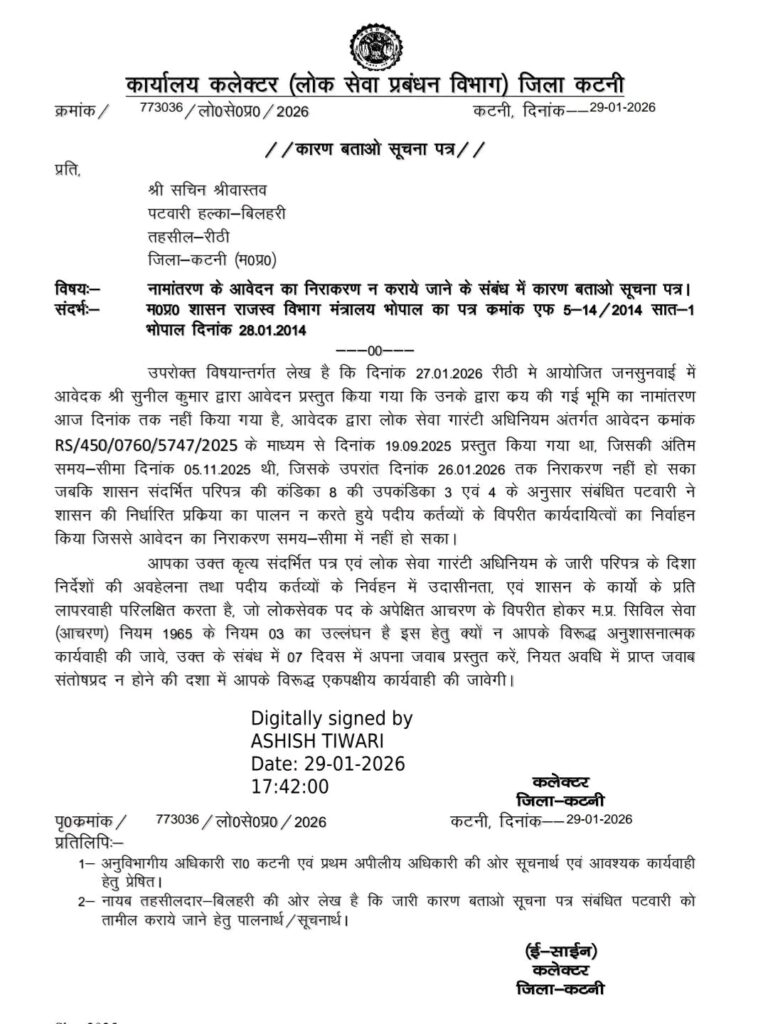 इसी प्रकार कलेक्टर श्री तिवारी ने पटवारी सचिन श्रीवास्तव को कारण बताओ नोटिस जारी करते हुये जारी कारण बताओ नोटिस में कहा है कि आपका यह कृत्य संदर्भित पत्र एवं लोक सेवा गारंटी अधिनियम के जारी परिपत्र के दिशा निर्देशों की अवहेलना तथा पदीय कर्तव्यों के निर्वहन में उदासीनता, एवं शासन के कार्यों के प्रति लापरवाही परिलक्षित करता है, जो लोकसेवक पद के अपेक्षित आचरण के विपरीत होकर म.प्र. सिविल सेवा (आचरण) नियम 1965 के नियम 03 का उल्लंघन है। इस हेतु क्यों न आपके विरूद्ध अनुशासनात्मक कार्यवाही की जावे। उक्त के संबंध में 7 दिवस में अपना जवाब प्रस्तुत करें, नियत अवधि में प्राप्त जवाब संतोषप्रद न होने की दशा में आपके विरूद्ध एकपक्षीय कार्यवाही की जावेगी।