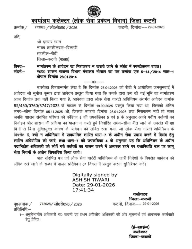 कटनी – लोक सेवा गारंटी अधिनियम के तहत नामांतरण के एक मामले में 80 दिनों से अधिक की देरी करने पर कलेक्टर श्री आशीष तिवारी ने बिलहरी के नायब तहसीलदार इसरार खान से स्पष्टीकरण मांगा है और बिलहरी के हल्का पटवारी सचिन श्रीवास्तव को ‘कारण बताओ सूचना पत्र’ जारी किया है।